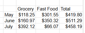 July cost me $50 less than June did all told. I had more than doubled my grocery, but did 1/6th of spending on Fast Food. $20 of the fast food was on the first and the second, before I decided to do this challenge.